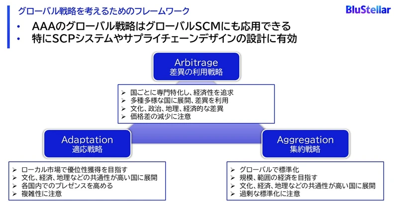 山口:グローバル戦略を考える上で有名なフレームワークに「トリプルA」があります。これは アダプテーション(適応)/アグリゲーション(集約)/アービトラージ(裁定) の3つの要素から成り立ちます。