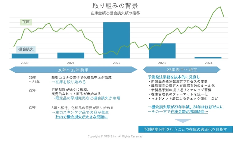 梶下氏:パンデミックは、化粧品業界に大きな影響を及ぼしました。外出機会が減少してメイク品需要が激減。オルビスの在庫も徐々に積み上がり、過去最大級の水準にまで達しました。そこから生産調整などを行い、在庫を減らしていったのですが、行動制限の緩和などで需要が戻り始めたタイミングでは逆に供給が追いつかず、大きな機会損失を発生させてしまいました。