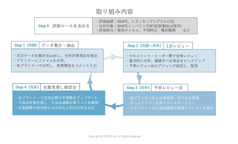 そして、評価の物差しを決めたうえで、次のような予測精度分析の管理プロセスを導入し、毎月、このサイクルを回しています。