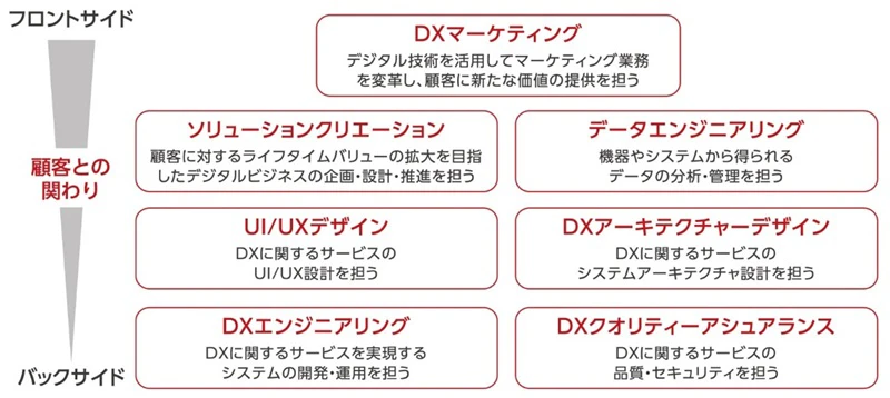 西川氏:ビジネスのフロントサイドで活躍する人財像からバックサイドで活躍する人財像まで7つの人財を定義しています(図)。この定義を見れば、DXプロジェクトの中で、どのような強みや特徴を持つ人財が、どのような役割を担うのかが明確にわかります。また、それぞれをDXに初めて取り組む段階、実務で活用できるレベル、事業や組織をけん引するレベルの初級・中級・上級の3つに分け、段階的な成長の道筋を示しています。