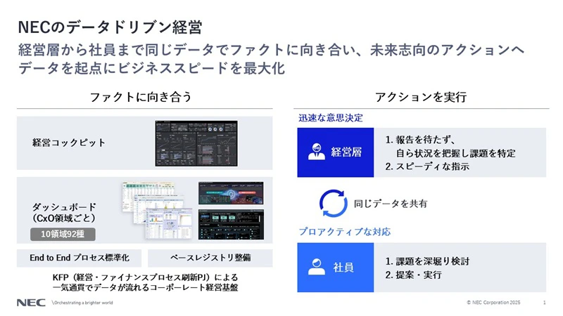 データの共有と可視化にとどまらず、未来を予測し、要因を明らかにして改善に結びつける。NECの挑戦は、ただの最新技術の活用ではなく、企業経営や意思決定を変革する取り組みである。この経験で得られた知見が、これからのNECを支えるとともに、お客様のDXにも貢献する大きな力となるだろう。