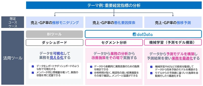 このような要因分析に近いデータの掘り下げは、 BIツールを使って人手で可視化と分析をすることも多いですが、私たちの試算によると、dotDataを活用すれば、BIツールを使った場合の5分の1の工数で分析を行えます」(亀谷)。