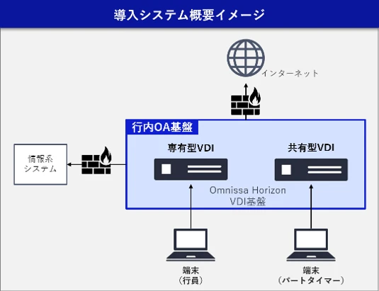 行内業務システムを利用するVDI基盤をOmnissa Horizonフルクローンで構築。ハイスペックCPUを搭載したサーバによる専有型VDIを採用し、NECの知見を活かしたサイジングでパフォーマンス向上を図った。ファイアウォールの構成も変え、ゼロトラストセキュリティに準拠した