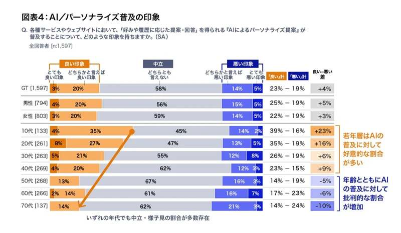 AIに対する印象は世代によって明確な違いが見られ、若年層ほど好意的