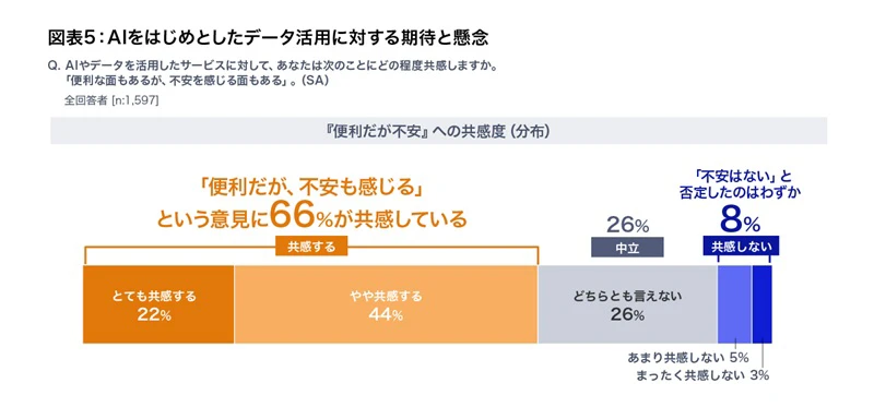 さて、続いて図表5の「AIやデータを活用したサービス」は約3人に2人(66%)が「便利だが不安」と回答している結果について見ていきましょう。