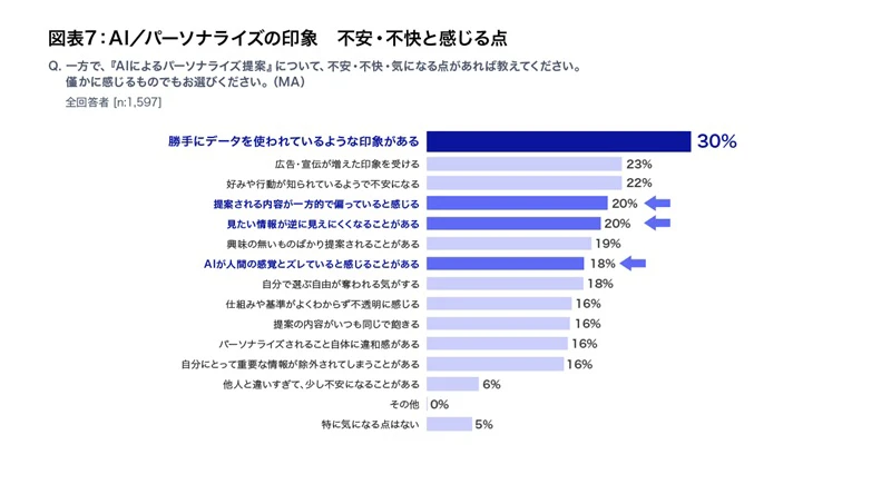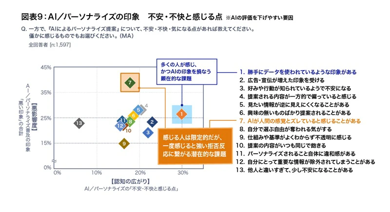 ―最も広く持たれている不安は「勝手なデータ利用」などプライバシー懸念だが、根深い不信感に繋がるのは「AIの感覚がズレている」と感じる質の低い体験への失望 -