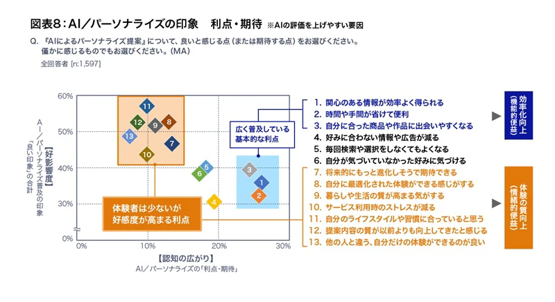 グラフ左上に位置している要素は、AI/パーソナライズに好印象の人ほど感じている利点であり、好感度が高まる要素と考えることができます。ここにはデジタルサービスにおける「体験の質向上(情緒的便益)」に関する回答が集まっている傾向が見えています。