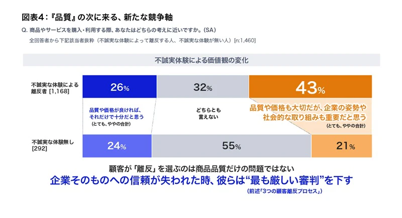 不誠実な体験によって離反した顧客のうち、43%が「企業姿勢や発信内容は重要」と回答。彼らにとって離反とは、製品への不満ではなく、企業そのものへの信頼が失われた時の最終審判である。 -