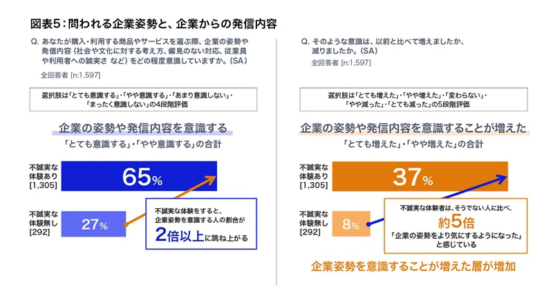 まず、図表4では、不誠実な体験をしたことがある人の43%が「品質や価格も大切だが、企業の姿勢や社会的な取り組みも重要」だと考えている結果になりました。このことから、現在の消費者が製品やサービスの品質だけでなく、企業の姿勢や発信内容も重視するようになったことがうかがえます。また、デジタル環境の変化により、消費者自身が、企業がどういう姿勢で自分たちに接しているか、自分たちをどう考えているか、その企業が信頼に足る存在かどうかを自分自身で見て判断しようとしているように考えられます。