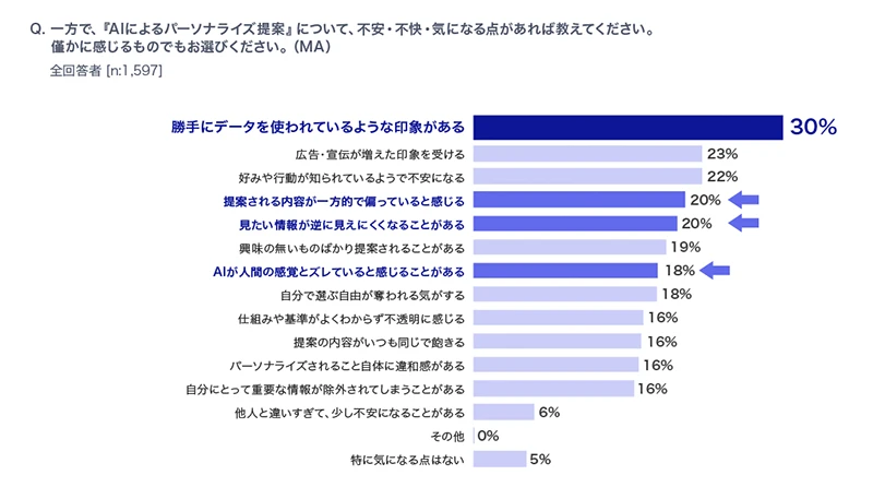 AIは便利である一方、勝手にデータを使われている感覚、仕組みの不透明さ、提案の偏りなどが不安を生んでいます。消費者はAIそのものより、「AIにどう扱われるか」で評価している—この構図が、第1回のデータからはっきり見えます。