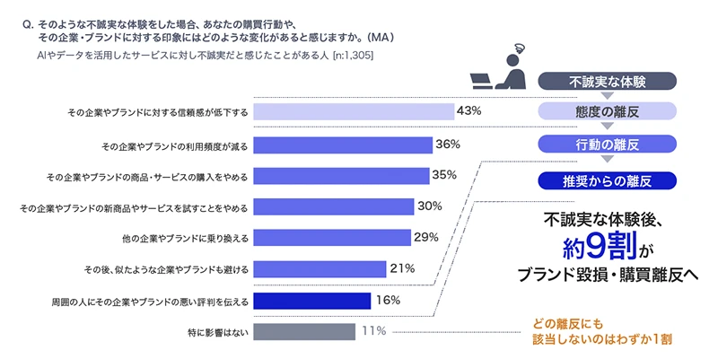 調査では、デジタルサービス利用時に「不誠実だ」と感じる体験をした人が8割超にのぼりました。透明性の欠如や、不親切なUX/UI(いわゆるダークパターンに近い体験)が、顧客の離反を引き起こします。離反は利用停止で終わらず、否定的発信を通じて拡大し得る—第2回で整理した「心→行動→言葉」という離反プロセスが、現実に起きています。