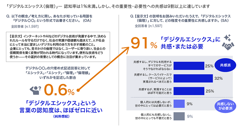 デジタルエシックスという言葉の認知は0.6%と低い一方、説明すると重要性への共感は91%にのぼります。しかし「利用中のサービスがデジタルエシックスを取り入れていると感じる」人は16%に留まります。需要はあるのに供給が追いつかない—信頼をめぐる最大の矛盾です。