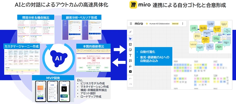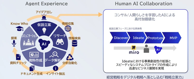 このHuman AI Collaborationのさらなる高度化を図るため、2025年5月にMiro社と戦略的協業を締結した。Miro社はSaaS型のイノベーションワークスペース「Miro」を提供する世界的ベンダーだ。このサービスは、オンラインホワイトボードを介してチームの共同作業を支援するものであり、企画・マーケティング、製品設計・デザインなどの場面で情報やイメージを気軽に共有できる。また実装されたAI機能によって深いインサイトを得られるため、議論の深化や課題探索、アイデアのブラッシュアップを促進する。