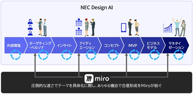 もちろん、オンラインホワイトボード上の結果はNEC Design AIに簡単に戻すことができる。合意形成したアイデアの具現化をNEC Design AIに指示すれば、すぐにMVPが作成される。「課題解決や価値創出の取り組みにスピーディにチャレンジできるため、理想的なアジャイル開発が可能になります」と町田は話す。新たな課題が見つかれば、Miroを活用したディスカッションに戻り、再び合意形成を図る。こうして新たな価値創造サイクルが体現されることになる。