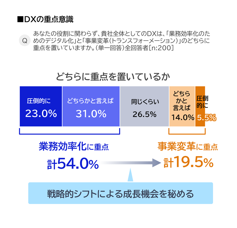 今回、NECが実施したDX実態調査でも、「業務効率化に重点を置いている」という企業が多数を占めていました(図1:DXの重点意識、「DXの最新動向と変化を読み解く実態調査2026」より)。効率化は企業活動にとって不可欠ですが、それだけでは競争優位にはなりません。むしろ効率化だけを追求すると、既存の枠組みの中で最適化が進むだけで、構造そのものは変わらない。その結果、DXの停滞を招いている可能性があります。