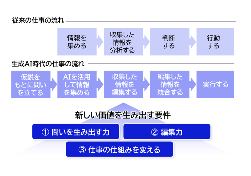 DXは単なるIT導入や業務効率化のための施策ではなく、企業や組織の知的基盤そのものを再設計する営みであると言えます。生成AIによって仕事の流れが変化しています。従来は「情報を集める→分析する→判断する→行動する」でしたが、今は「仮説をもとに問いを立てる→情報を集める→編集する→統合する→実行する」という流れに変わりつつあります。仕事のあり方そのものが変わる中で、AIは情報整理の役割を担い、人間は情報の意味付けと判断を担う。この役割を前提にすると事業変革の実現には、①問いを生み出す力、②編集力、③仕事の仕組みを変えることが不可欠になります。