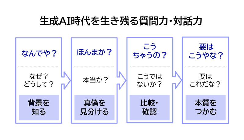 では、どうやったら問いを生み出す力を高められるのか。私は、大阪商人の「なんでや?」「ほんまか?」「こうちゃうの?」「要はこうやな?」という対話を通した思考法が、問いを深めるプロセスとして非常に有効だと考えています。
