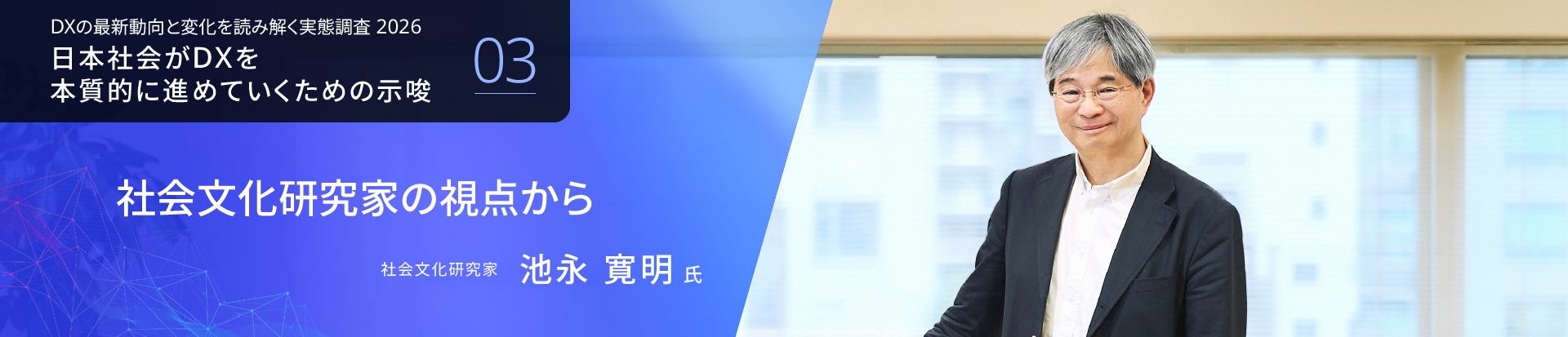 第三回目は、社会文化研究家の池永寛明氏へのインタビューを通して、問い・編集力・仕組みという視点から、日本型DXの課題とAI時代に新しい価値を生み出す道筋を読み解きます。