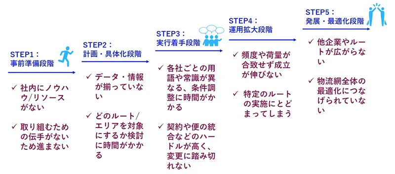 とはいえ、条件の合うパートナー企業を見つけ、日々変動する荷量を調整しながら、オペレーションを回すのは容易ではない。共同輸配送を最適化していくには段階的に5つのステップを踏んでいく必要があるからだ。このステップを少しでも前進させていくため、NECでは2024年10月に「共同輸配送プラットフォーム」の提供を開始した。