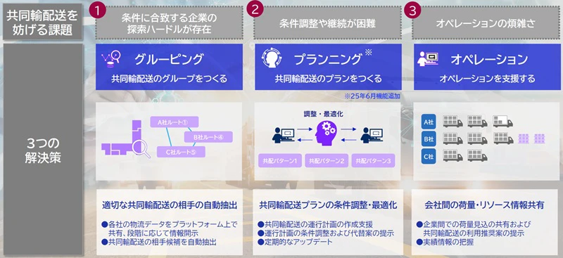 まず「グルーピング」で、各社が登録した物流ルートや車両種別などの情報をもとに、共通点のある企業を自動的に抽出し、共同配送の候補を見つける。次に「プランニング」では、入力された条件に基づいて相手企業とマッチングし、効率的な配送計画を立てる。最後に「オペレーション」で、自動生成されたルートをもとに、最終的な条件を確定し、実際の運行に移る仕組みだ。