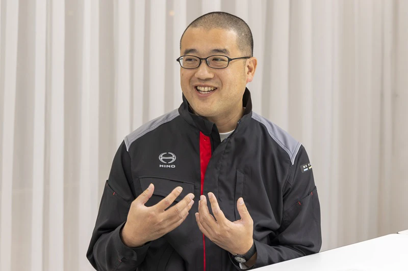 - # インタビュー当日は会社のユニフォーム姿で参加いただいた。左腕には、HINOウェイとして掲げている「誠実」「貢献」「共感」が記されている
