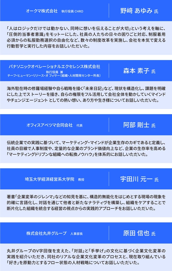 これまで少し触れてきたように、コミュニティの設計は明快だ。前半は有識者によるインプットと質疑応答で、その目的は普段考えないような視座や視点をもたらす「刺激」を提供することにある。登壇者には、オークマ 執行役員 CHRO 野﨑 あゆみ氏をはじめとする登壇者たちが名を連ね、企業変革のジレンマ、構造的無能化、フロー状態といったテーマを素材に、次のアクションに向けたロジックを解説する(以下参照)。参加者たちはもともと自社の課題に対する問題意識を持っているため、そうした刺激を自分ごとの課題に結び付けながら、吸収していく。