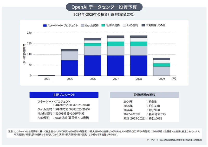 その後もOracleと3000億ドル、NVIDIAと1000億ドル、AMDと数百億ドル規模の契約を発表。これらの投資に基づき、OpenAIは今後5年の間、毎年数千億ドル規模のデータセンターを設立していくことになる。