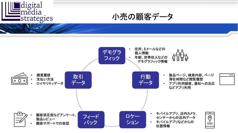 企業や業種によって多少の解像度の違いはあるものの、現在の北米における小売業では、顧客データの収集施策によって、下図のようなデモグラフィック、行動データ、ロケーション、フィードバック、取引データを収集可能となっている。