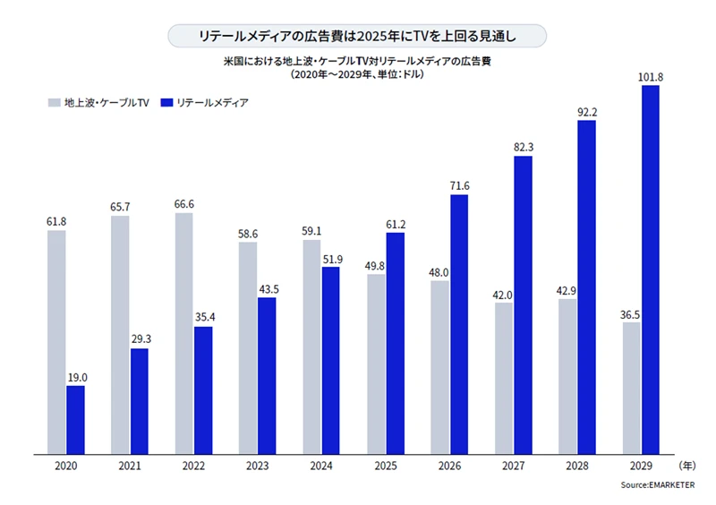 実際にリテールメディア領域の広告は活性化している。下図は米国における「リテールメディア広告費」と「地上波・ケーブルTV広告費」を比較したもので、2025年ついにリテールメディア広告費が逆転した。2026年以降もリテールメディア広告費は着々と伸び、2029年にはほぼ倍増すると予測されている。
