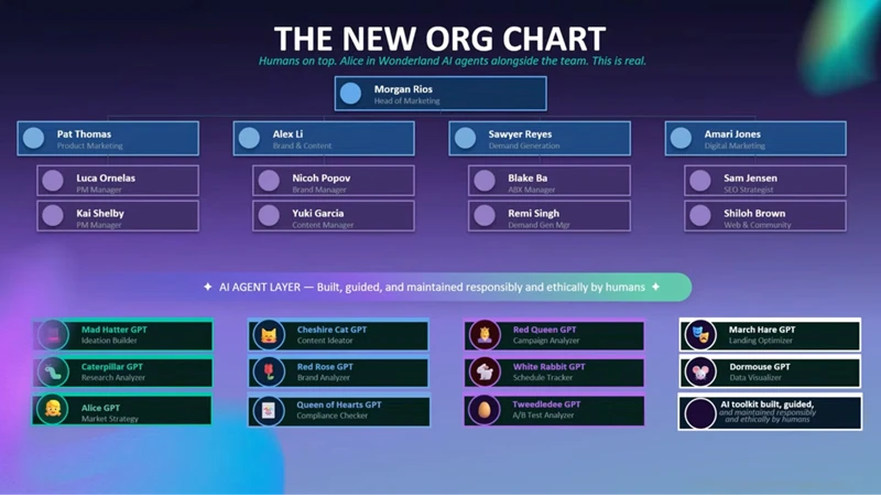 マーケティング組織のトップの下に、「製品マーケティング」「ブランディング・コンテンツ」「需要創出(デマンドジェネレーション)」「デジタルマーケティング」部署が置かれている。各部署にはそれぞれに部署長が存在し、その下に2人ずつマネージャーが配置されている。マネージャーの下には「アイデア開発」「コンプライアンス確認担当」「A/Bテストアナリスト」「ランディングページ最適化」など多数のAIエージェントがおり、各部署の2人のマネージャーは、これらのAIエージェントを管理しながら業務を行う。