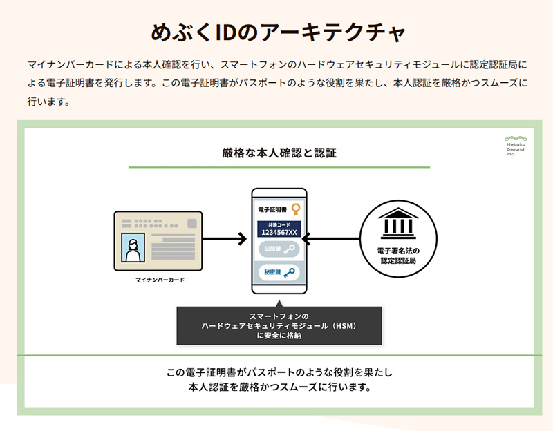 谷内田氏:「めぶくID」は、官民共同出資で設立した「めぶくグラウンド」という会社が運営しています。マイナンバーカードによる本人確認を実施したうえで、スマートフォンのICチップに秘密鍵を入れるなど複数の技術要素を組み合わせて、安全なデジタル認証基盤を構築しています。特定の技術ありきではなく、人を中心において都市全体で安心して使われることを前提に設計した点が特徴です。