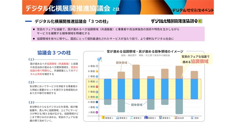 またそのためには、行政と民間が共同で標準化すべき協調領域(インフラ)と、自治体や企業ごとに工夫を凝らす競争領域を明確に分けることが必要です。そしてそこでは、多様なステークホルダーが参加するフェアな協議の場で、合意形成を進めることが重要になると思います。