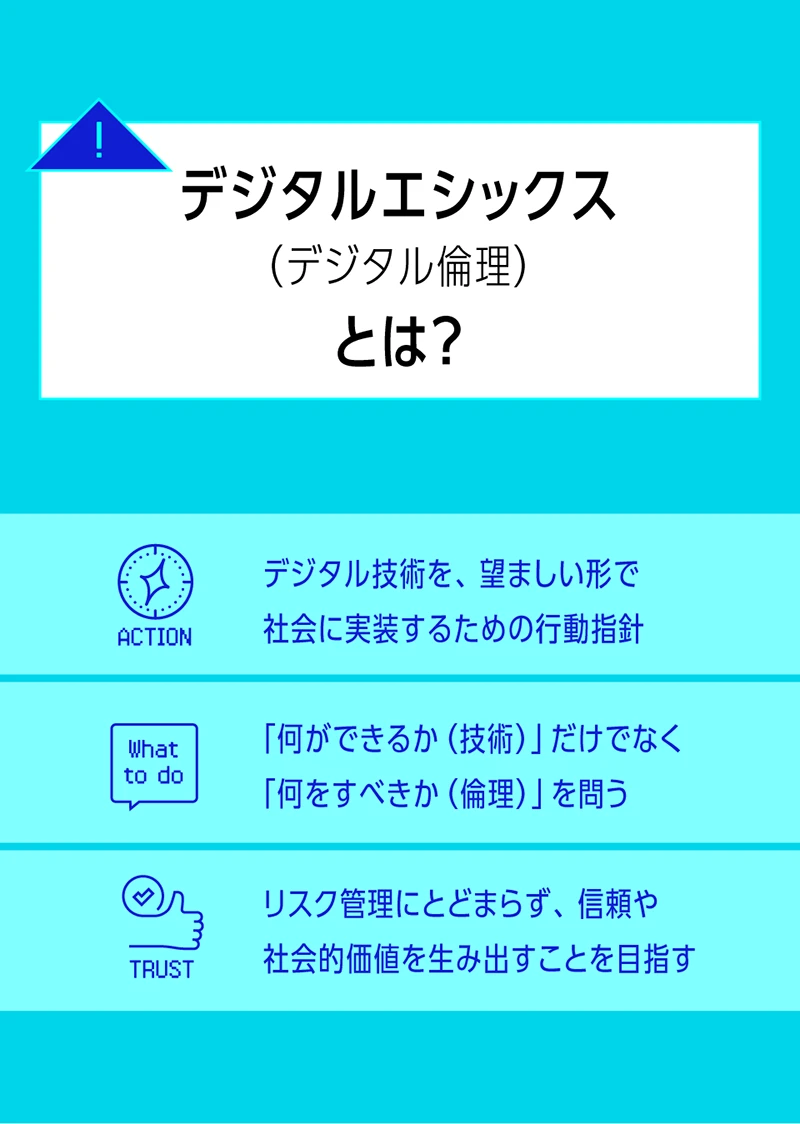 「何ができるか(技術)」だけでなく「何をすべきか(倫理)」を問い、社会に望ましい形でのデジタル利用を目指す。